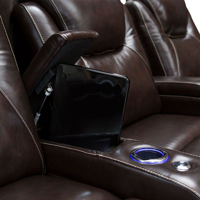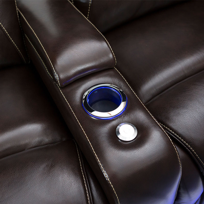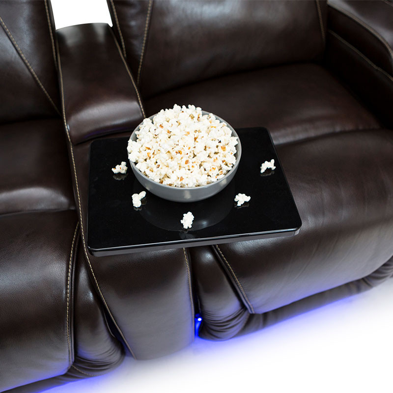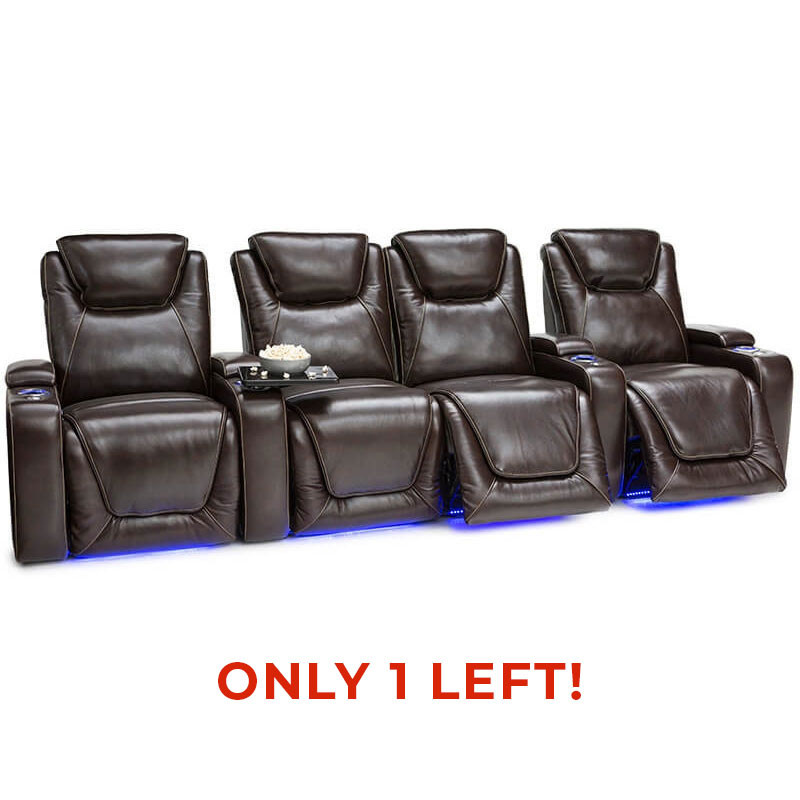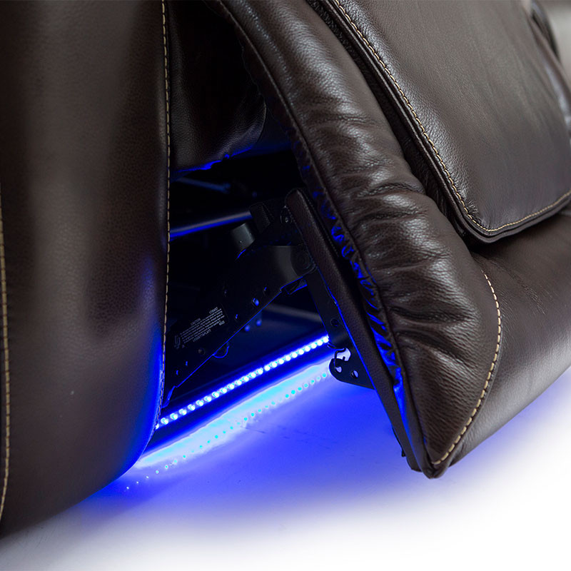 The ultimate in comfort & support Equinox Home Theater Seating features power recline, headrest, and lumbar allowing you to adjust your viewing angle and support to create the seat most comfortable to you. Contrast stitching provides an elevated look to this Premium Leather Home Theater Seating. USB charging ports, lighted cup holders, base lighting, in-arm storage and tray tables make this the best seat in the house. To further increase the functionality of this seat, an included “Memory” button saves your favorite position, so that you can always relax in the position of your choice at the touch of a button. Take Your viewing experience to the next level with SoundShaker, this seat comes equipped with Transducers, when you choose to add on an amp, the SoundShaker technology will enhance the movie experience by shaking the chair in sync with the on-screen action.