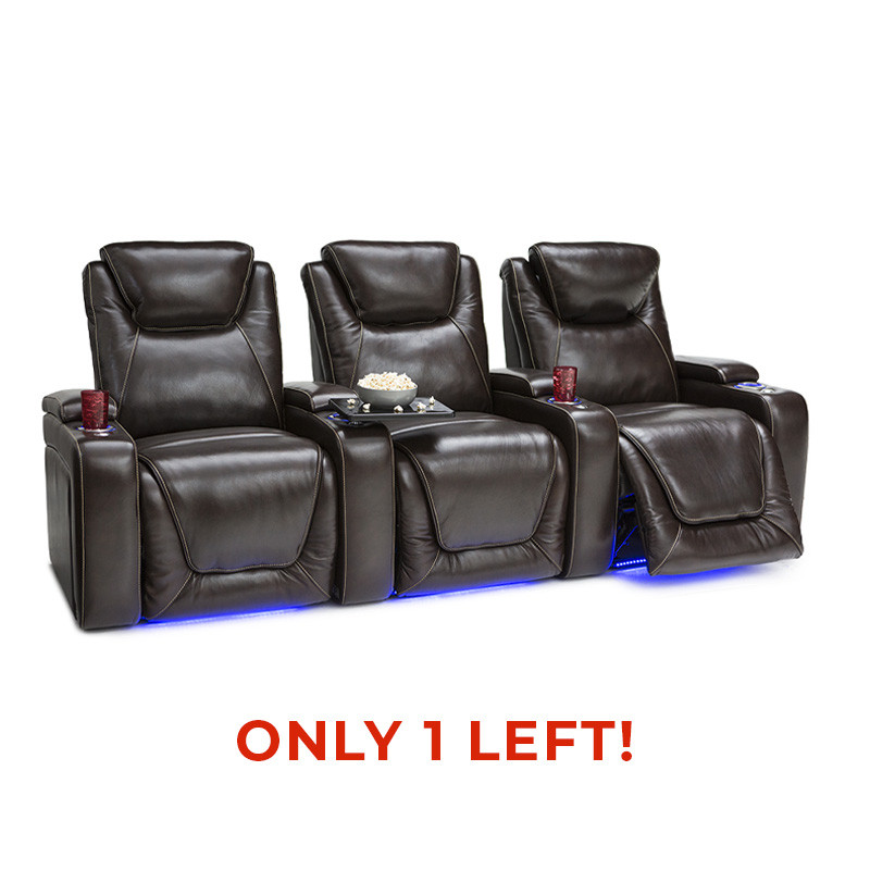 The ultimate in comfort & support Equinox Home Theater Seating features power recline, headrest, and lumbar allowing you to adjust your viewing angle and support to create the seat most comfortable to you. Contrast stitching provides an elevated look to this Premium Leather Home Theater Seating. USB charging ports, lighted cup holders, base lighting, in-arm storage and tray tables make this the best seat in the house. To further increase the functionality of this seat, an included “Memory” button saves your favorite position, so that you can always relax in the position of your choice at the touch of a button. Take Your viewing experience to the next level with SoundShaker, this seat comes equipped with Transducers, when you choose to add on an amp, the SoundShaker technology will enhance the movie experience by shaking the chair in sync with the on-screen action.
