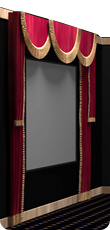 Soundright deluxe surround home theater curtains are designed with a geometrically complex tassle pattern, featuring three overlapping circular rings on top with parallel straight and rectangular patterns on the side. This ornate design lends the curtain a regal look, with additional touches of art-deco that echo Hollywood's glamour era. Choose from red, blue, or black velvet color options, with black or gold for the tassles in order to customize these surround curtains to your home theater's decor needs.