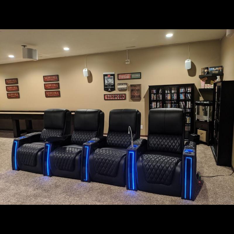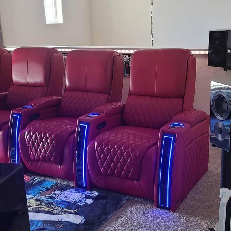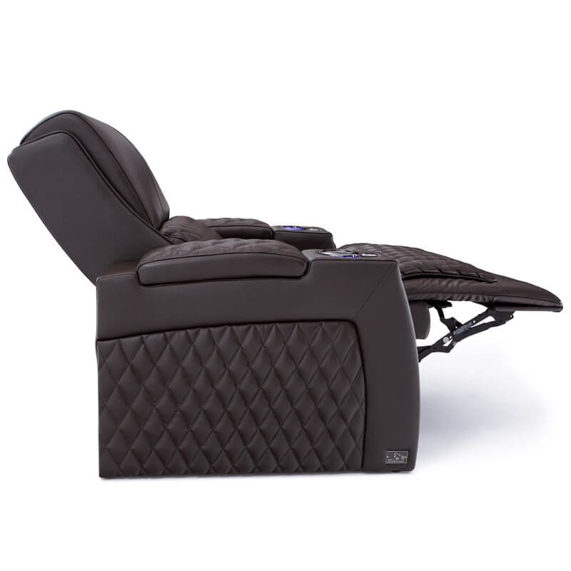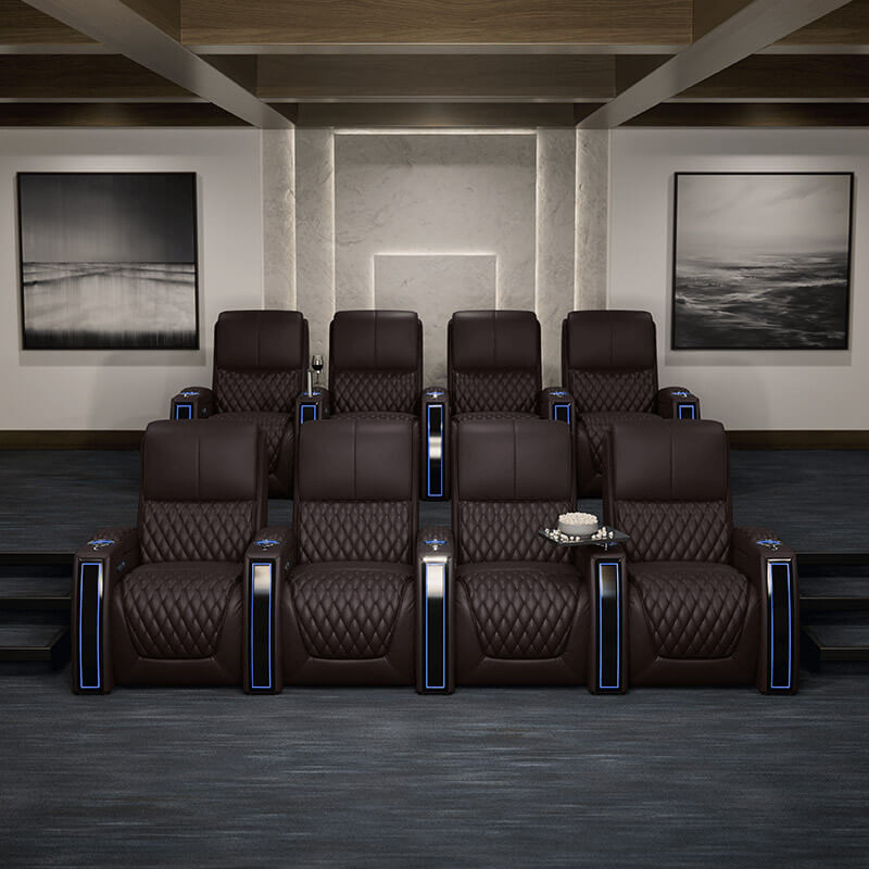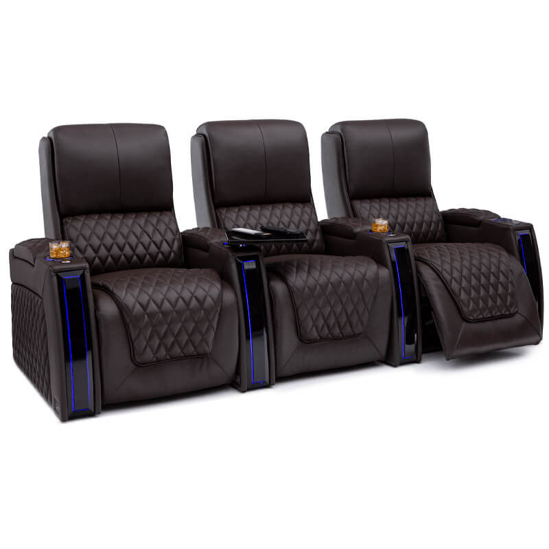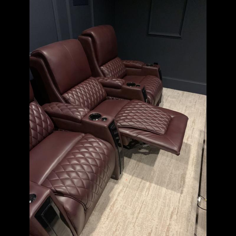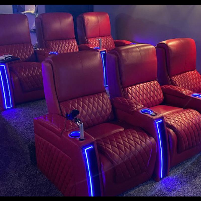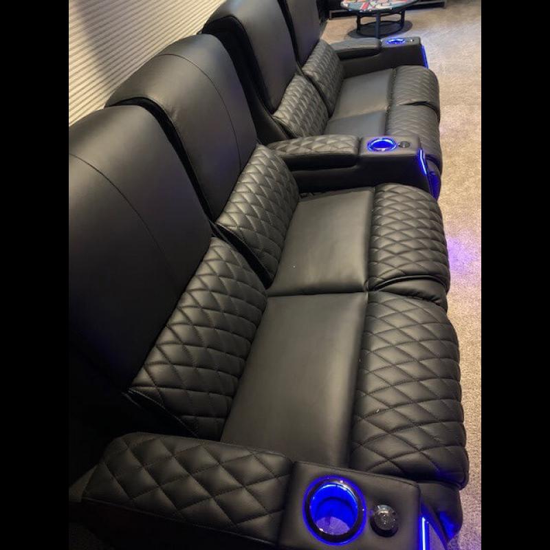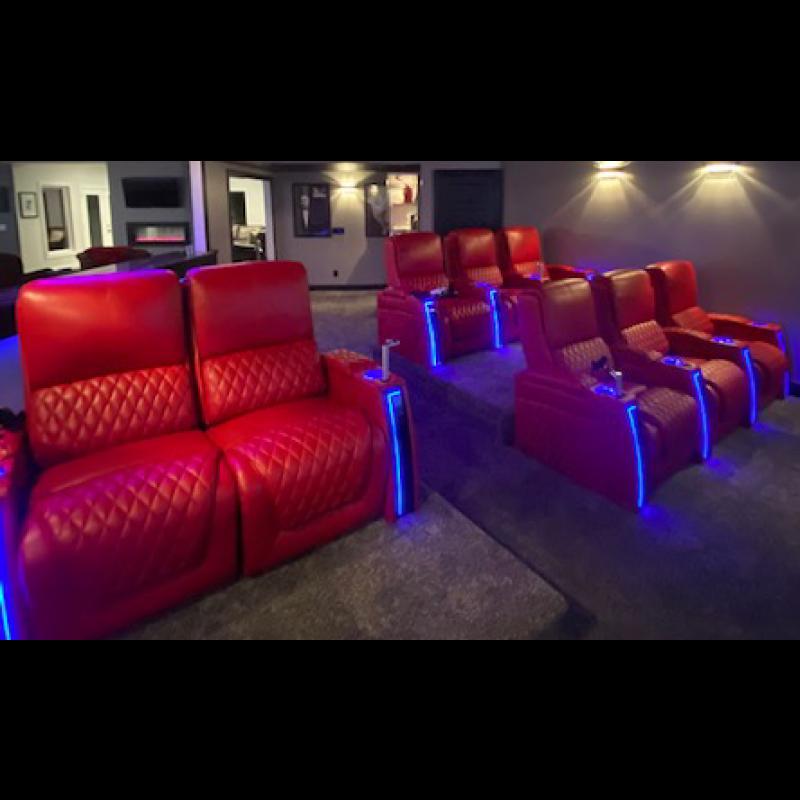 Create a row of Italian leather home theater seating in your choice of color, featuring power headrest, lumbar, and recline, Seatcraft Apex gives you a comprehensive range of comfort options with the touch of a button. Equipped with Lighted Cupholders, LED Armrest Accent Lighting, and a USB Charging Station these seats create the Best Home Theater Experience Possible. Hidden In-Arm Storage Compartments store an included Tray Table that is perfect for snacking while you enjoy the movie. Relax in Comfort with the Fully Extendable Chaise Style Power Recline Footrests. Built in Sound Shaker Transducers give you the ability to further elevate your Home Theater experience by adding on an Amplifier Kit to feel the screen action in your Home Theater Seats.