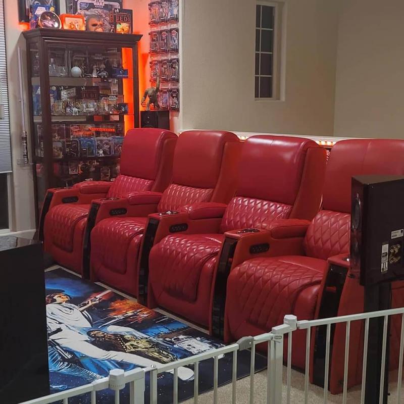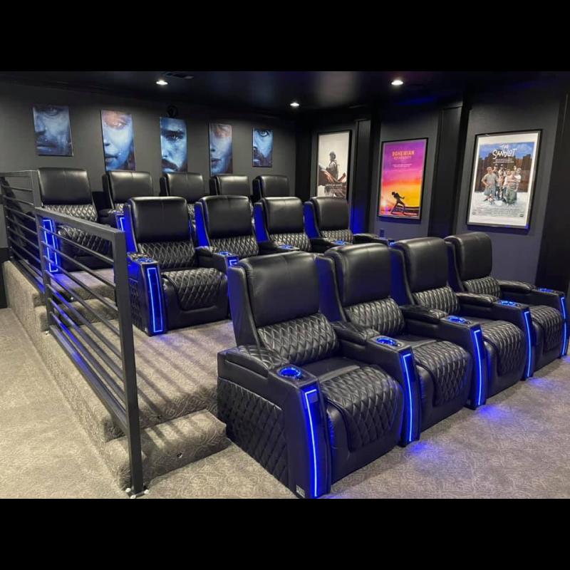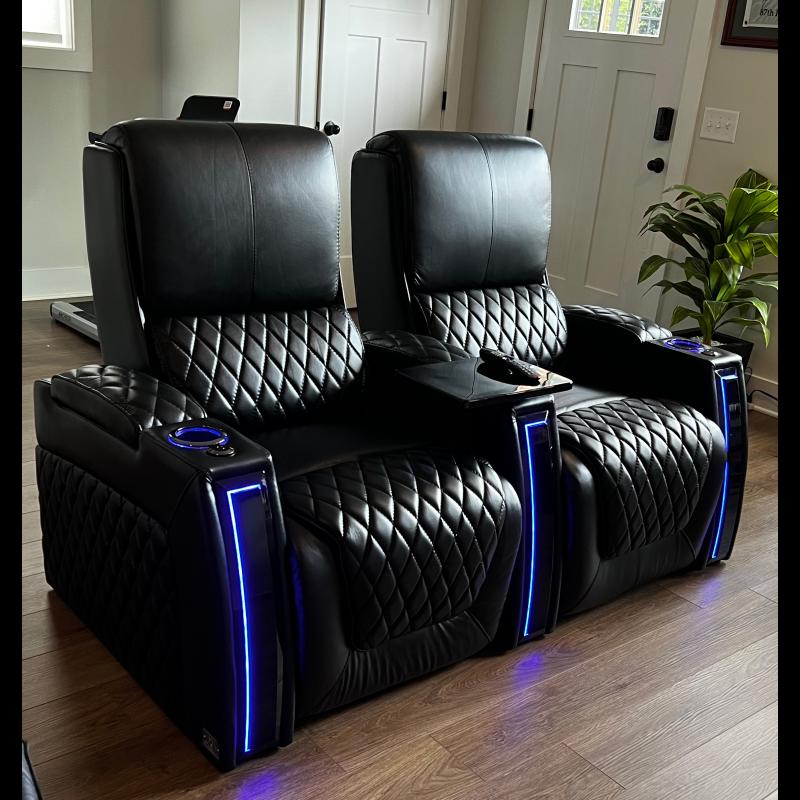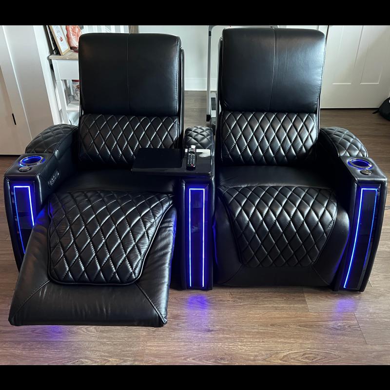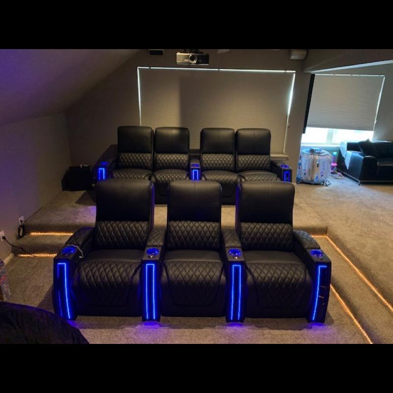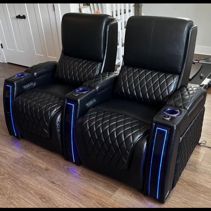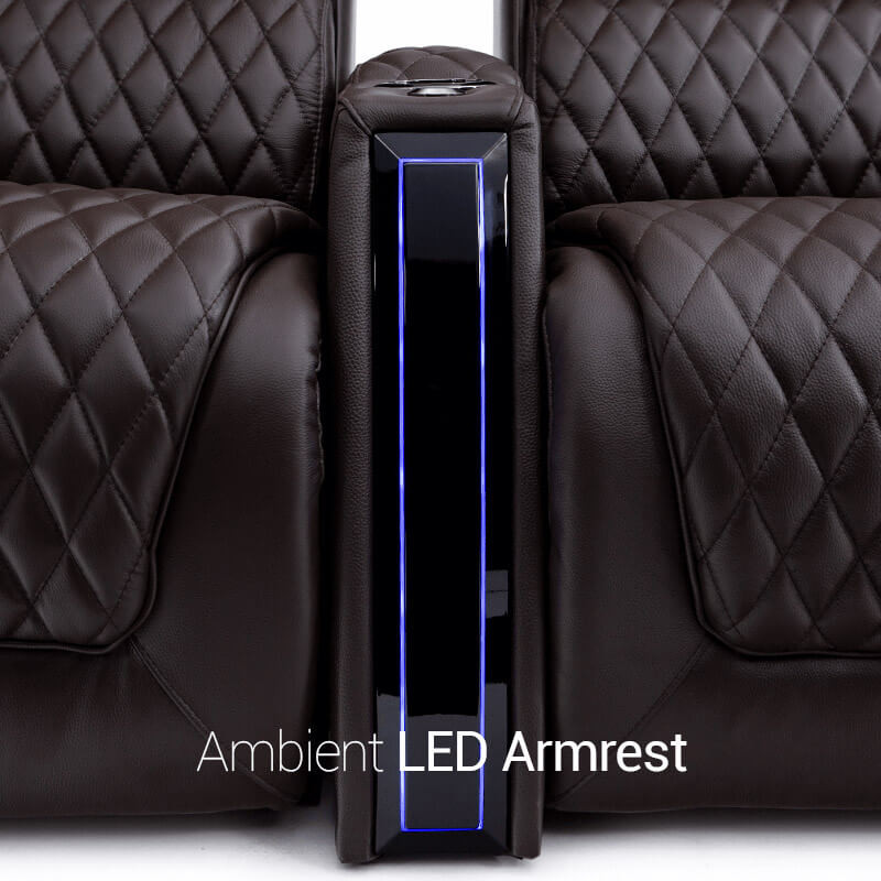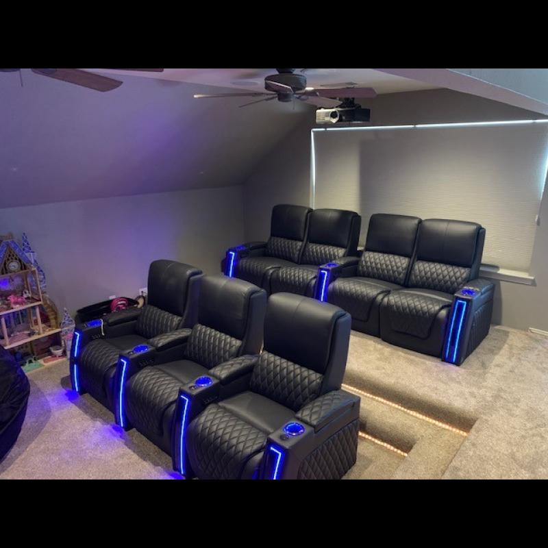 Create a row of Italian leather home theater seating in your choice of color, featuring power headrest, lumbar, and recline, Seatcraft Apex gives you a comprehensive range of comfort options with the touch of a button. Equipped with Lighted Cupholders, LED Armrest Accent Lighting, and a USB Charging Station these seats create the Best Home Theater Experience Possible. Hidden In-Arm Storage Compartments store an included Tray Table that is perfect for snacking while you enjoy the movie. Relax in Comfort with the Fully Extendable Chaise Style Power Recline Footrests. Built in Sound Shaker Transducers give you the ability to further elevate your Home Theater experience by adding on an Amplifier Kit to feel the screen action in your Home Theater Seats.