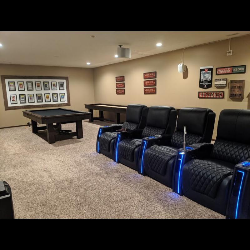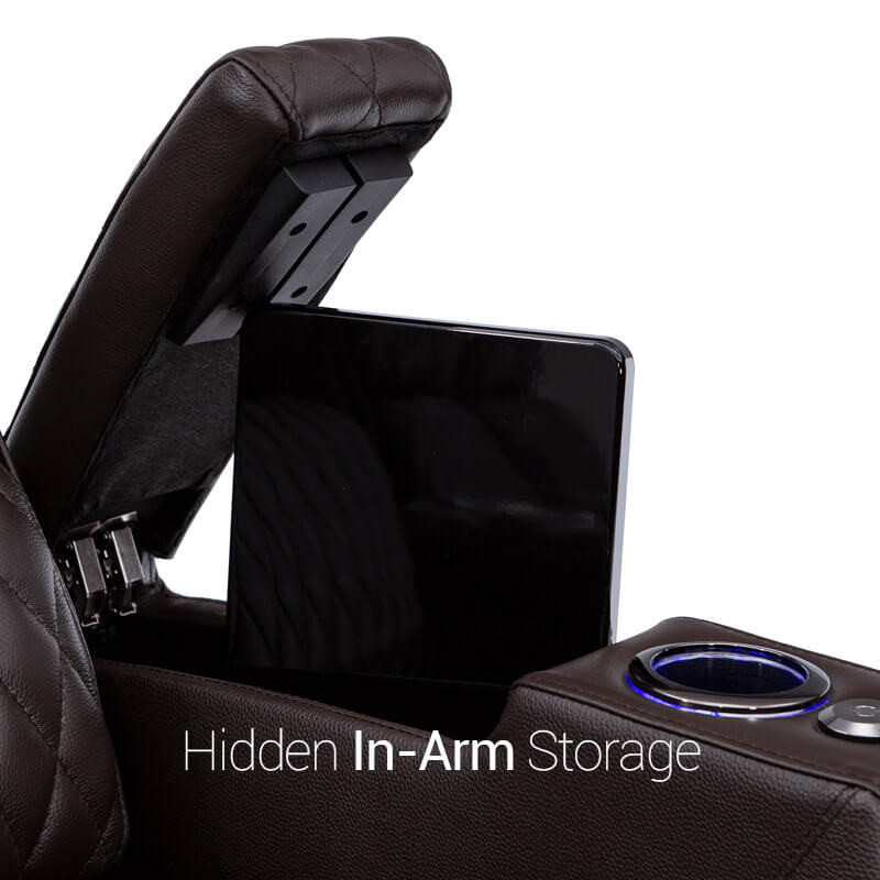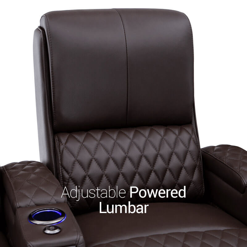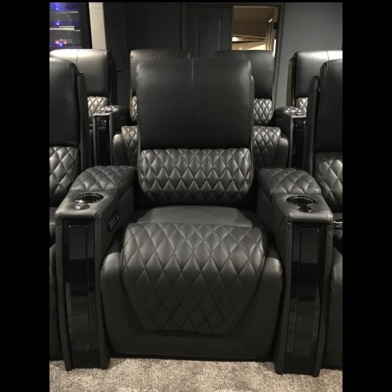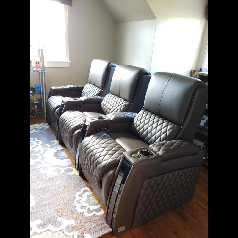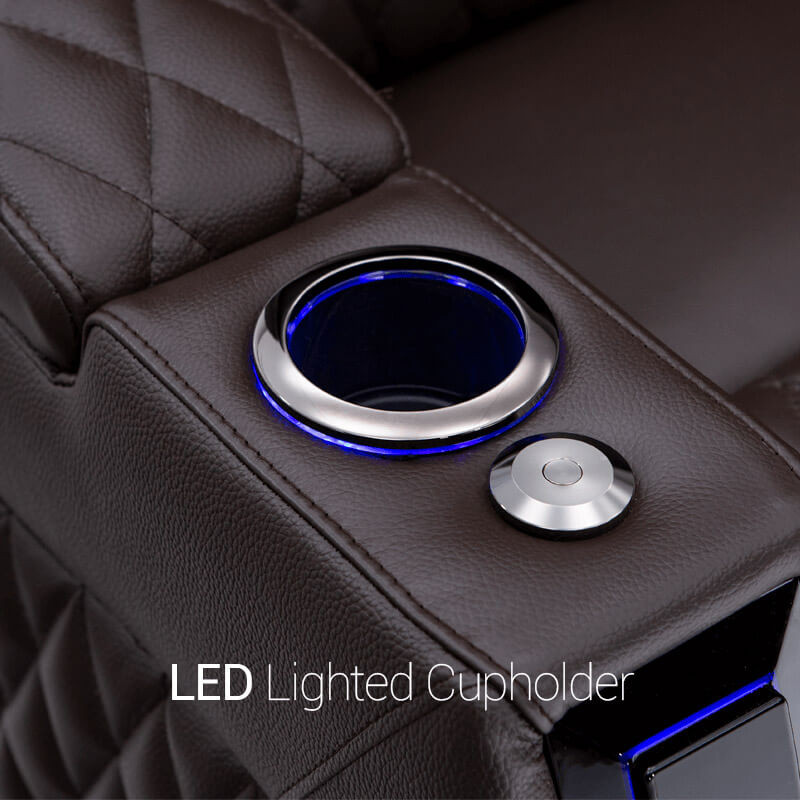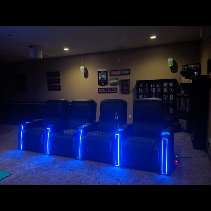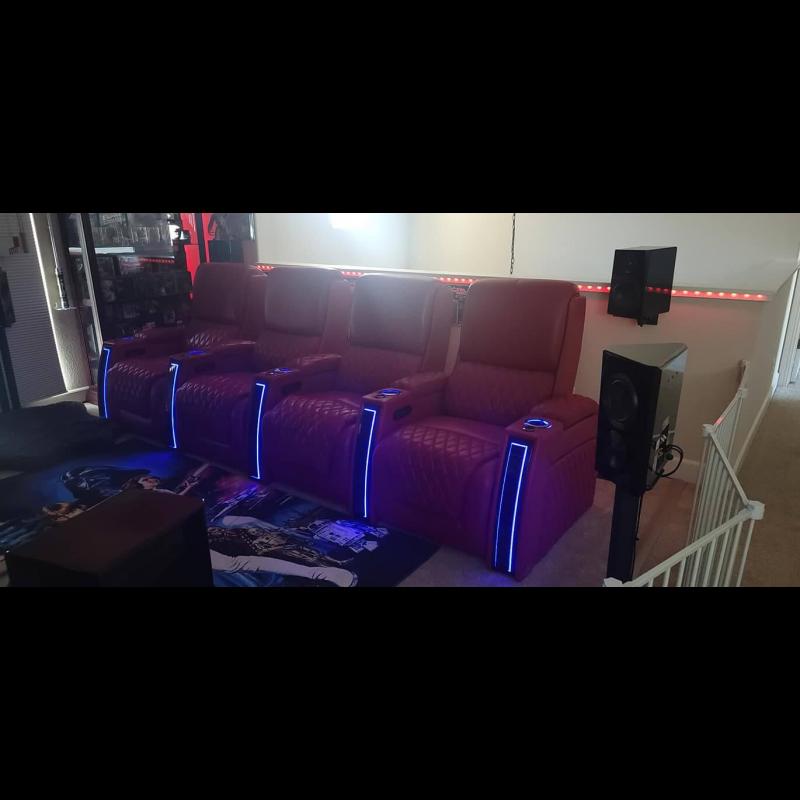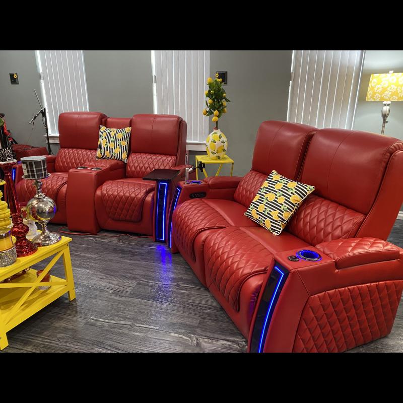 Create a row of Italian leather home theater seating in your choice of color, featuring power headrest, lumbar, and recline, Seatcraft Apex gives you a comprehensive range of comfort options with the touch of a button. Equipped with Lighted Cupholders, LED Armrest Accent Lighting, and a USB Charging Station these seats create the Best Home Theater Experience Possible. Hidden In-Arm Storage Compartments store an included Tray Table that is perfect for snacking while you enjoy the movie. Relax in Comfort with the Fully Extendable Chaise Style Power Recline Footrests. Built in Sound Shaker Transducers give you the ability to further elevate your Home Theater experience by adding on an Amplifier Kit to feel the screen action in your Home Theater Seats.