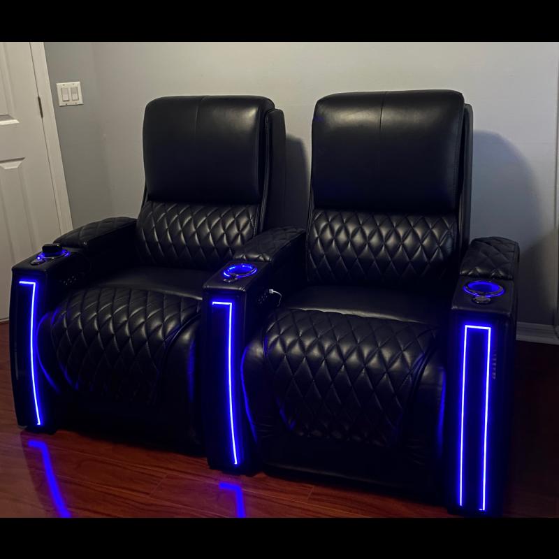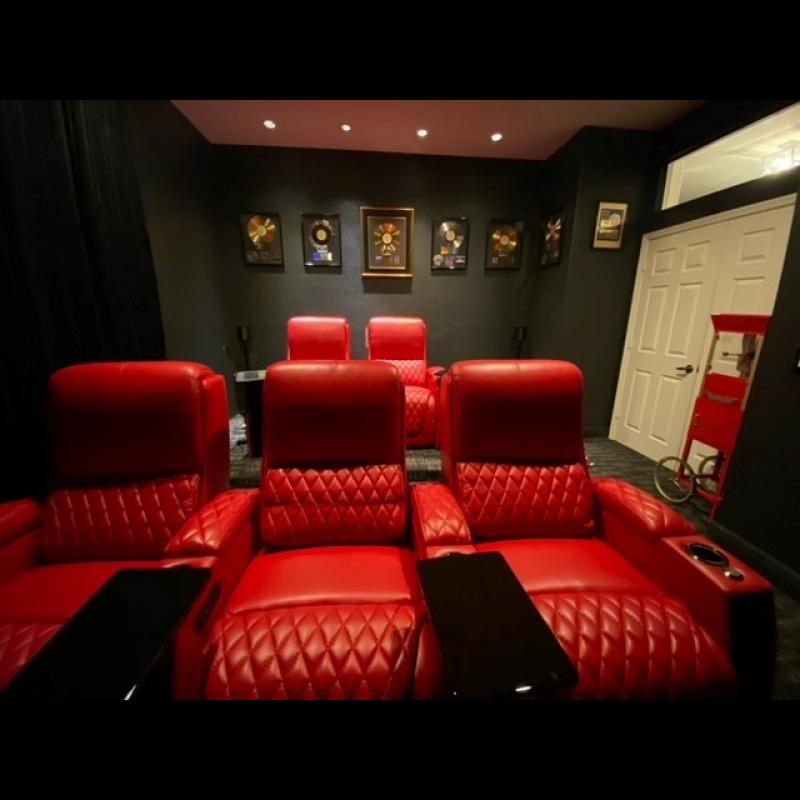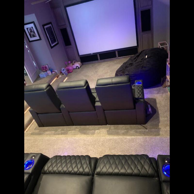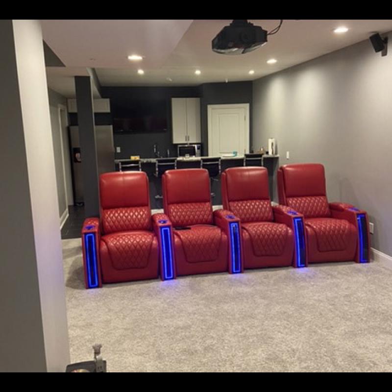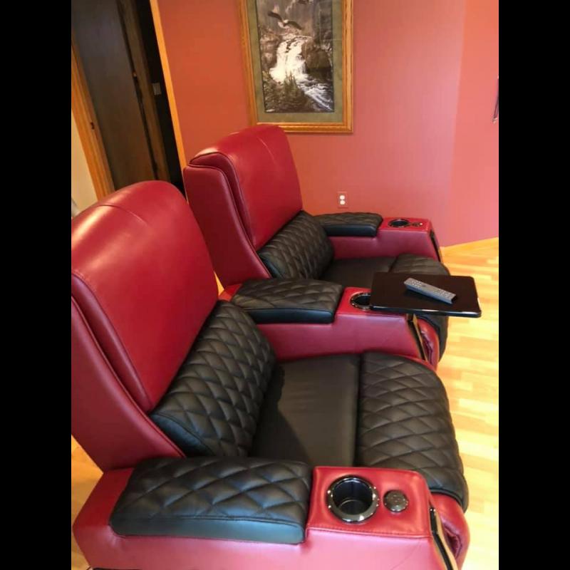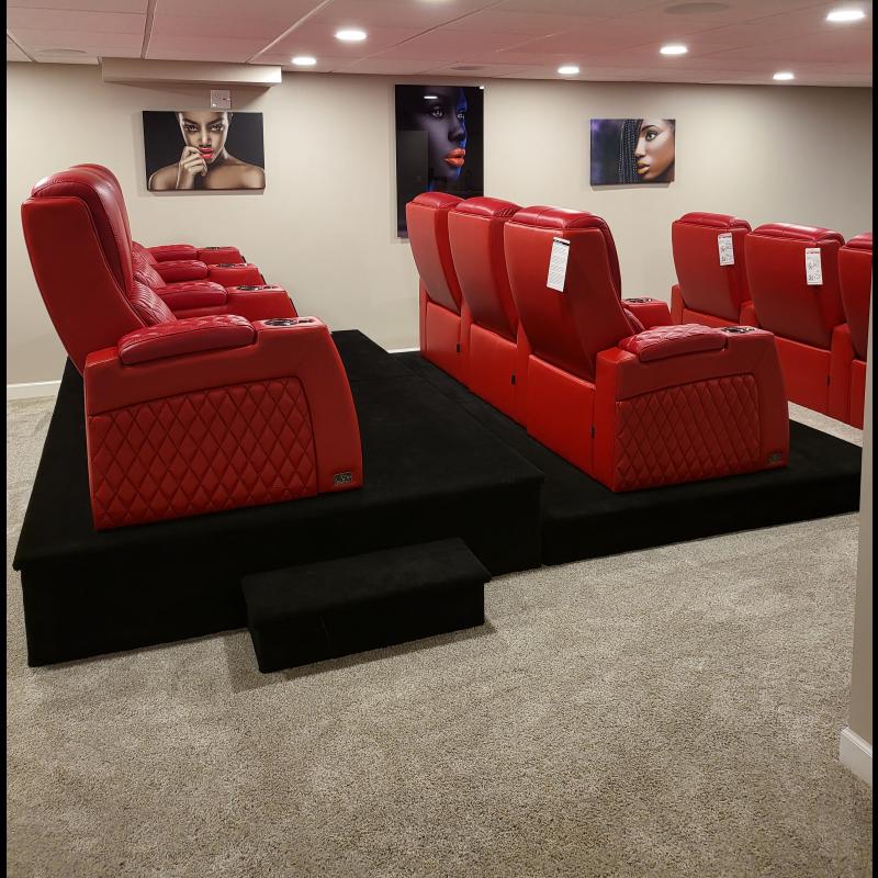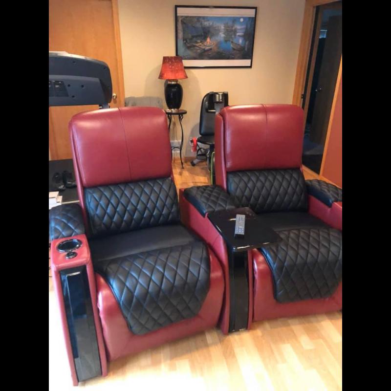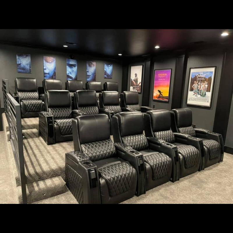 Create a row of Italian leather home theater seating in your choice of color, featuring power headrest, lumbar, and recline, Seatcraft Apex gives you a comprehensive range of comfort options with the touch of a button. Equipped with Lighted Cupholders, LED Armrest Accent Lighting, and a USB Charging Station these seats create the Best Home Theater Experience Possible. Hidden In-Arm Storage Compartments store an included Tray Table that is perfect for snacking while you enjoy the movie. Relax in Comfort with the Fully Extendable Chaise Style Power Recline Footrests. Built in Sound Shaker Transducers give you the ability to further elevate your Home Theater experience by adding on an Amplifier Kit to feel the screen action in your Home Theater Seats.