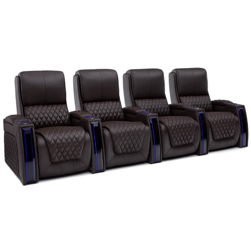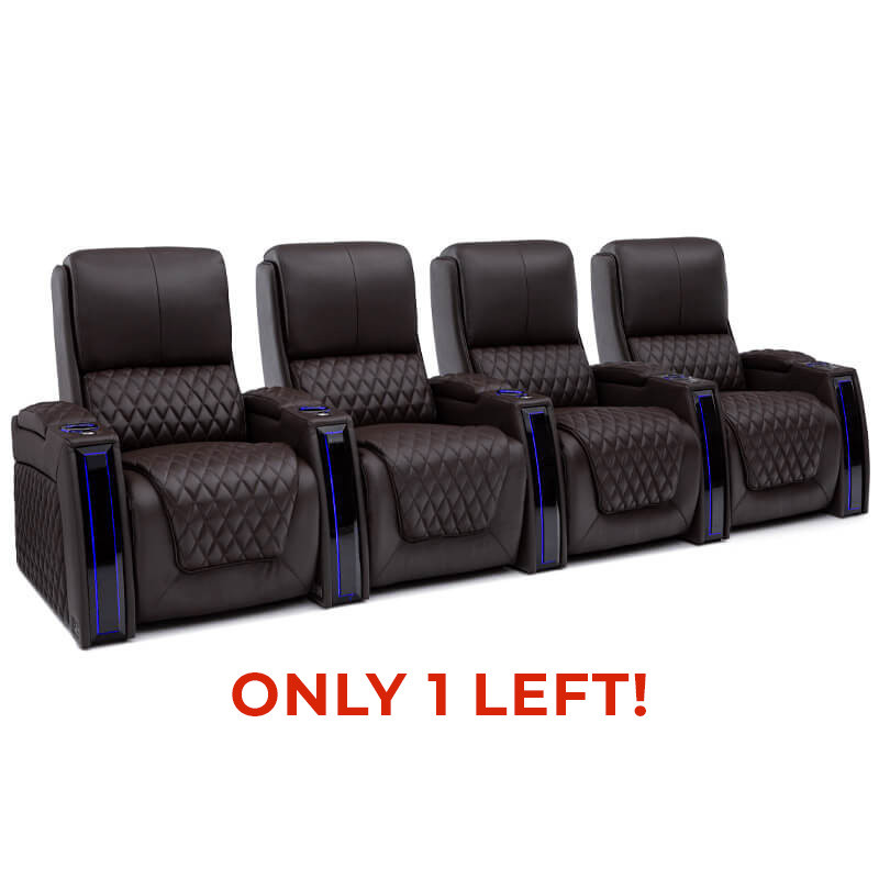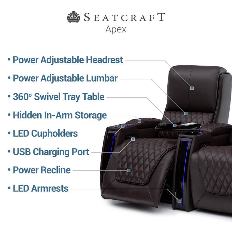 Create a row of Italian leather home theater seating in your choice of color, featuring power headrest, lumbar, and recline, Seatcraft Apex gives you a comprehensive range of comfort options with the touch of a button. Equipped with Lighted Cupholders, LED Armrest Accent Lighting, and a USB Charging Station these seats create the Best Home Theater Experience Possible. Hidden In-Arm Storage Compartments store an included Tray Table that is perfect for snacking while you enjoy the movie. Relax in Comfort with the Fully Extendable Chaise Style Power Recline Footrests. Built in Sound Shaker Transducers give you the ability to further elevate your Home Theater experience by adding on an Amplifier Kit to feel the screen action in your Home Theater Seats.