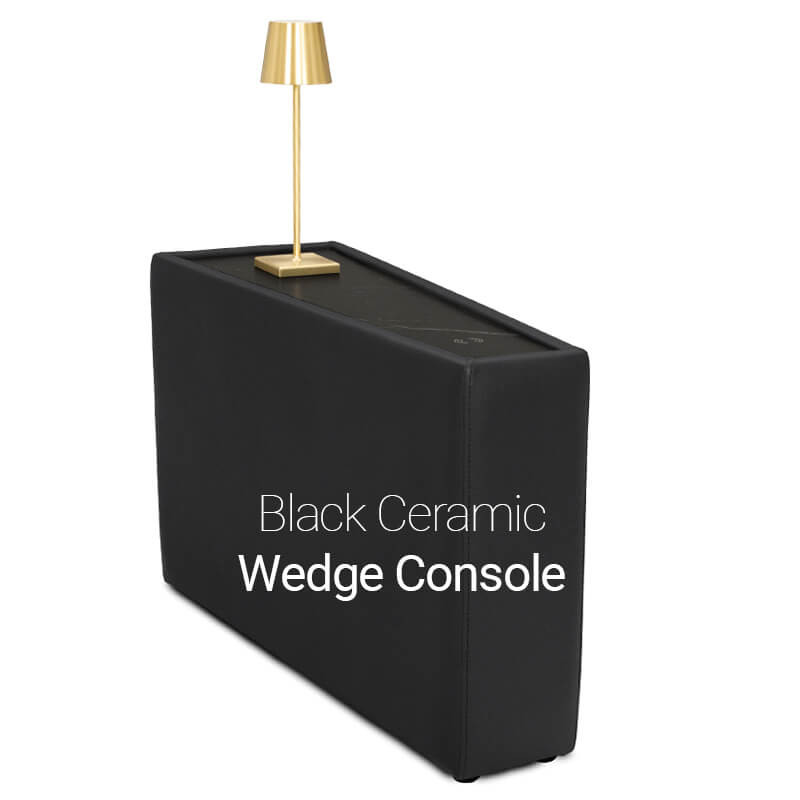 A console table is featured in between each arm to create an elegant and convenient experience.