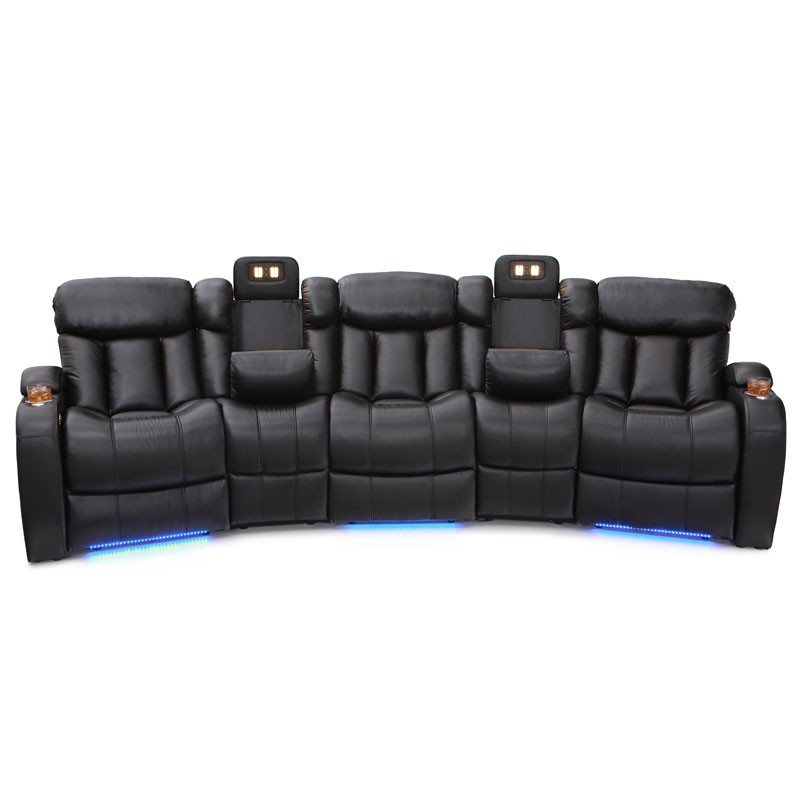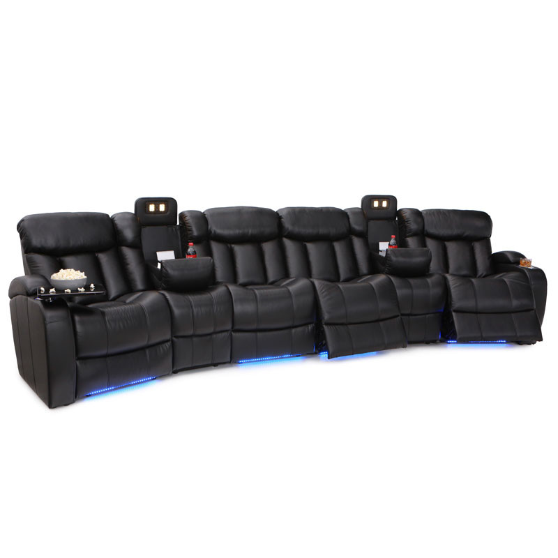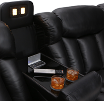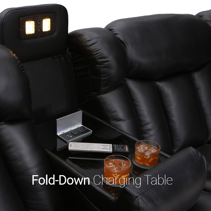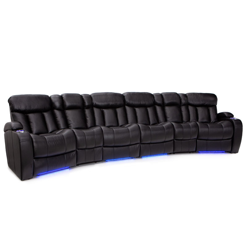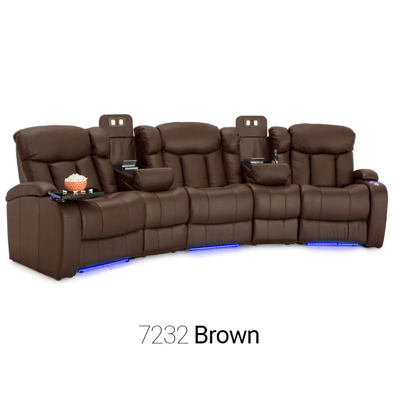 Unique fold-down consoles that feature tray table and overhead reading lights are included! In this manner, depending on the style and number of wedges used, the seats can be configured into loveseats, sofas, and curved rows, to suit theater requirements and individual taste. Meanwhile, ambient base lighting also gives off a warm azure glow designed to keep the seats of this beautiful home theater sectional discreetly illuminated in a darkened room.