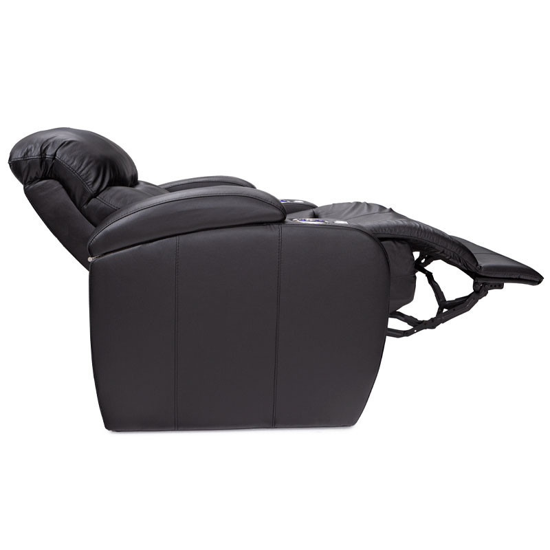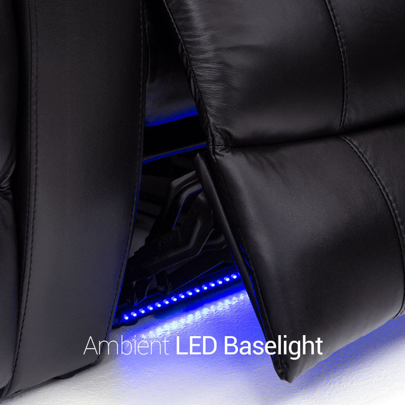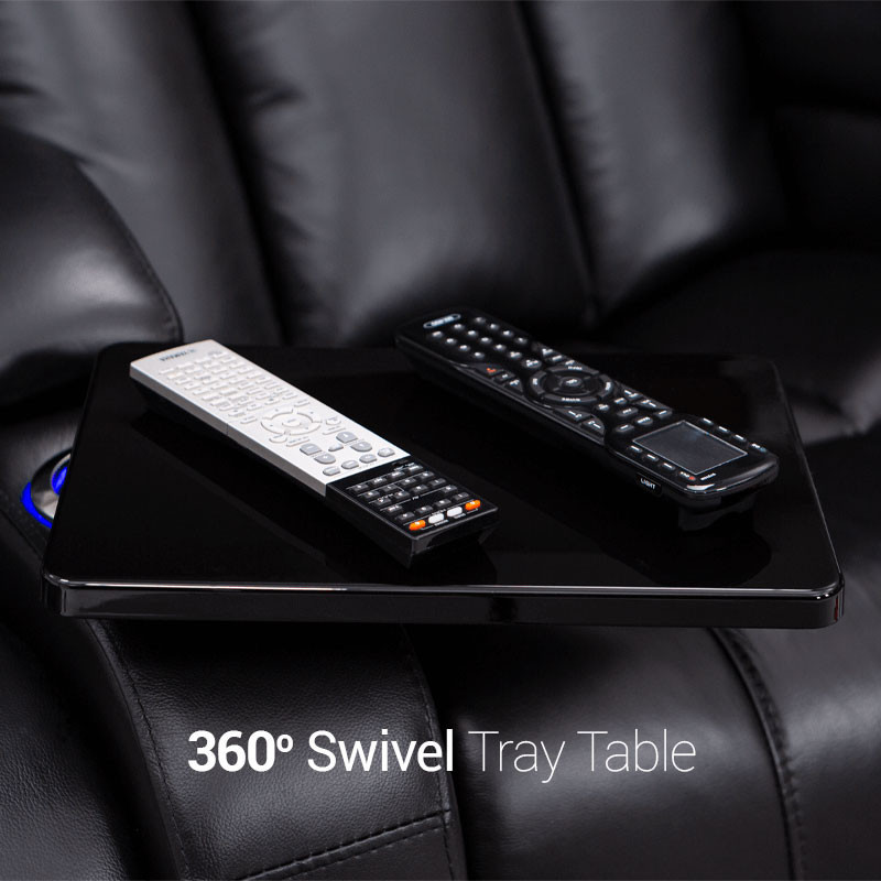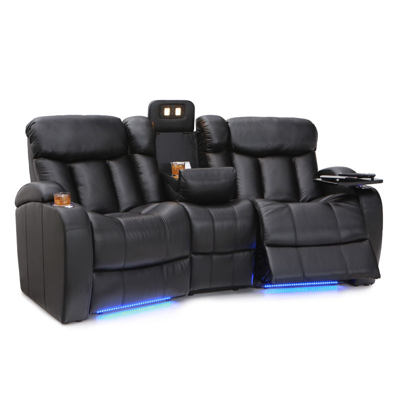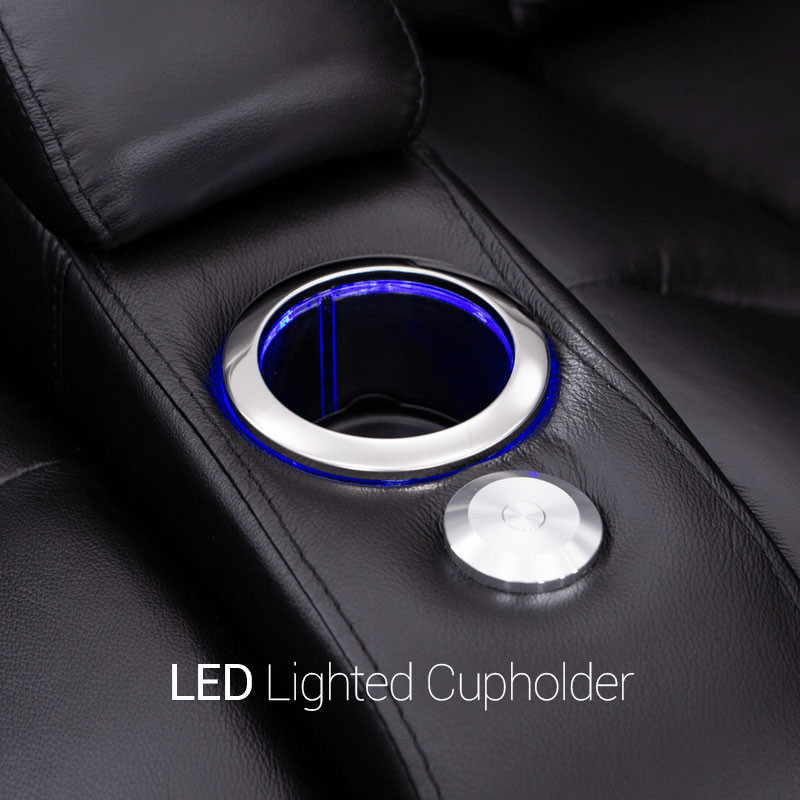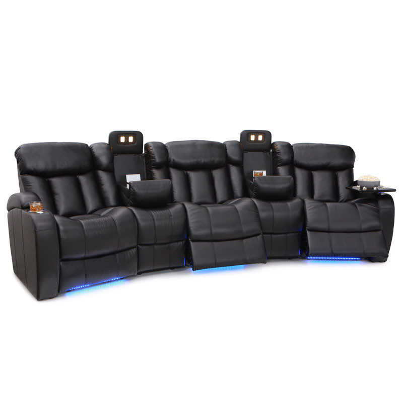 Unique fold-down consoles that feature tray table and overhead reading lights are included! In this manner, depending on the style and number of wedges used, the seats can be configured into loveseats, sofas, and curved rows, to suit theater requirements and individual taste. Meanwhile, ambient base lighting also gives off a warm azure glow designed to keep the seats of this beautiful home theater sectional discreetly illuminated in a darkened room.