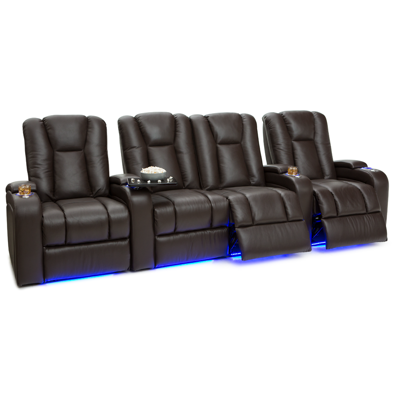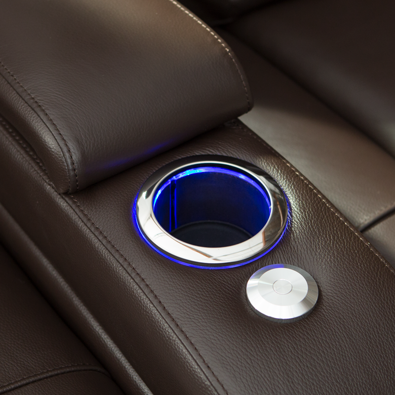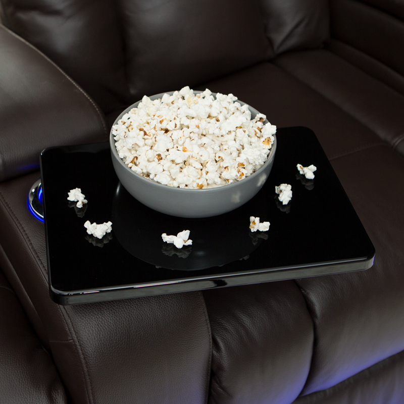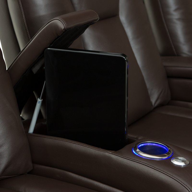 Meanwhile, lighted cup holders will gently illuminate your beverages, while ambient base lighting under the seat provides a discreet means for guests to find their way in a darkened room. Power recline lets you choose any desired position, and effortlessly change positions, at the mere press of a button, while a USB station by the power recline switch provides a place to charge cell phones and tablets. You can place any items such as phones, remotes, tablets, reading materials, snacks and more on included tray tables that attach easily to an accessory mount provided on the armrest. When finished for the evening, cleanup is a snap thanks to roomy storage compartments located in each armrest. Finally, save space in your home theater with the Serenity's "wall-hugger" feature, which allows the seat to be placed just inches from any wall, even as it fully reclines! These features all combine to create a fully-loaded home theater exprience that will dazzle friends and family for years to come.
