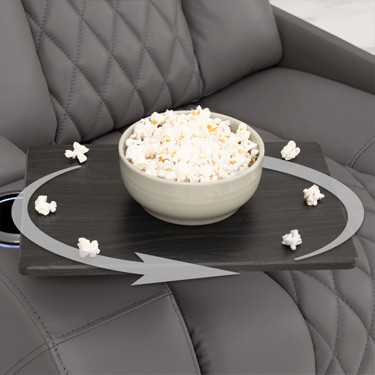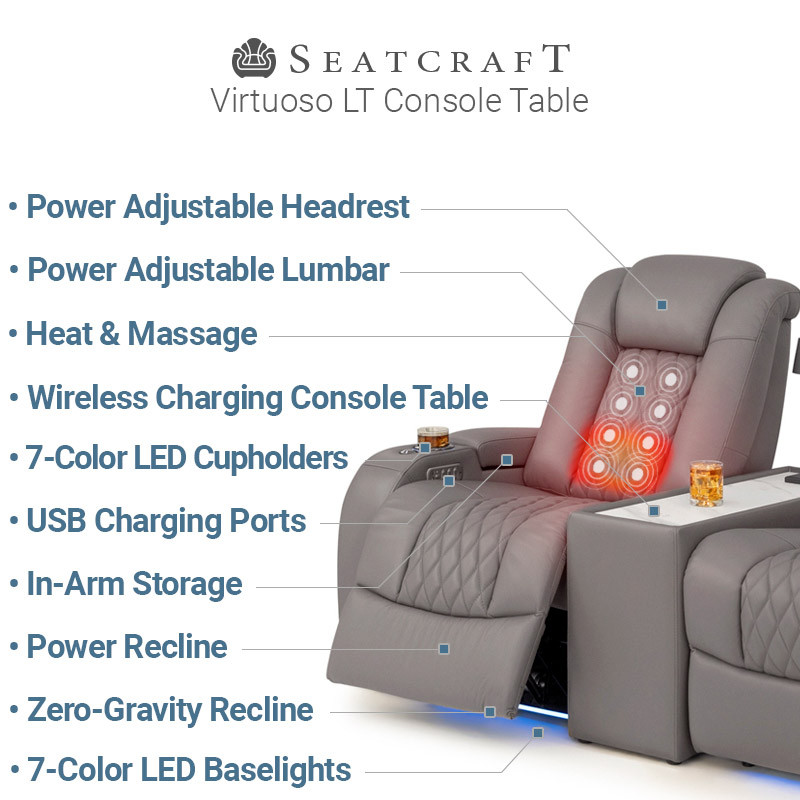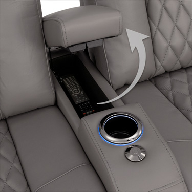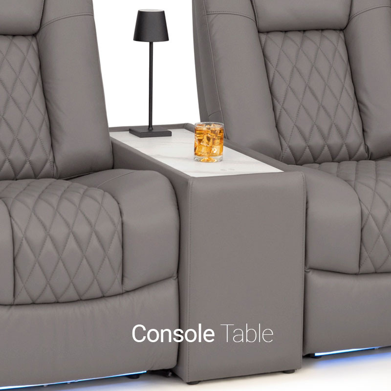 A console table is featured in between each arm to create an elegant and convenient experience.